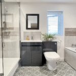With four piece suite comprising bath with deep feature tiled courses over and mixer tap, wide and deep shower cubicle with tiled walls and twin headed thermostatically controlled shower unit, vanity wash basin with cupboards below, tiled courses over and low level WC. Extractor unit, double glazed window and ladder type radiator.