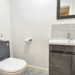 With white suite comprising low level WC, vanity wash basin with mixer tap and with cupboards below. Extractor unit and radiator.