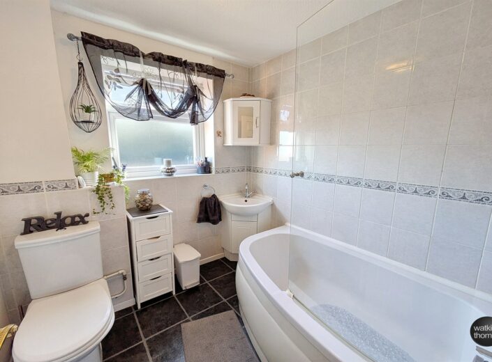 With rear aspect double glazed window, panel enclosed bath with electric shower over, vanity wash hand basin, low flush wc, partially tiled wall surround and wall mounted electric heater.