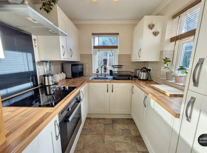 With rear and side aspect double glazed windows, a range of units comprising stainless steel sink drainer unit with work surfaces, tiled splash backs, base units under with matching wall units, integrated electric oven and hob with cooker hood over and laminated flooring.