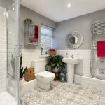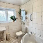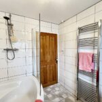 With white suite comprising offset corner bath with a thermostatically controlled shower unit over, low level WC and vanity wash basin with mixer tap. Fully ceramic tiled walls, tiled floor, double glazed window and ladder type radiator.