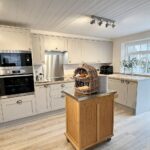Beautifully appointed and with corner shower cubicle with tiled walls and curved screen doors together with thermostatically controlled shower unit, pedestal wash basin with mixer tap and low level WC. Part tiled surrounds in a brick style, double glazed window, ladder type radiator and tiled floor. Recess with wood block working surface over. Plumbing for washing machine. Sunken ceiling lights.