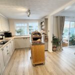 With modern soft close base cupboard units with wood grain effect working surfaces over, upstand, matching eye level cabinets and integrated waste/recycling bin. Concealed dishwasher, built in Bosch four ring induction hob with stainless steel splashback and cooker hood over, together with a built in hotpoint oven with microwave over. Enamel sink unit with drainer and mixer tap attachment. Recess for an upright fridge freezer and with a door to the garage/car port and a glazed panel door with adjacent window opens to the;