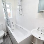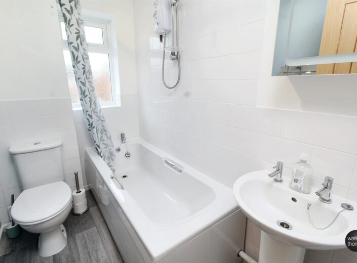 With front aspect double glazed window, suite comprising panel enclosed bath with electric shower over, low flush wc, pedestal mounted wash hand basin, heated towel rail and partially tiled wall surround.