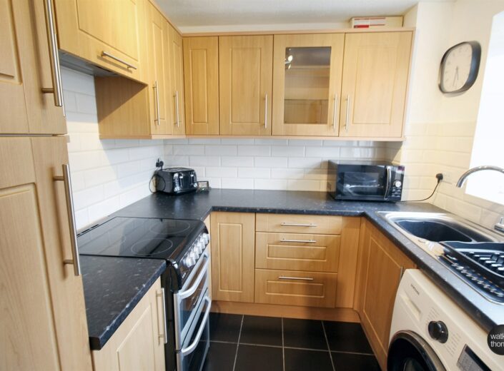 With front aspect double glazed window, stainless steel sink drainer unit with work surfaces, tiled splash backs, base units under with matching wall units, plumbing and space for washing machine, space for fridge freezer, space for cooker with cooker hood over and tiled flooring.
