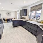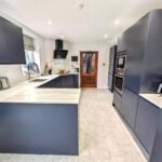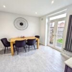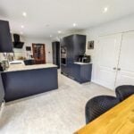 With rear aspect double glazed window. A range of units comprising sink drainer unit with Quartz work surface, base units under with matching wall units, integrated fridge freezer, integrated microwave and oven, electric hob with cooker hood over, cupboard housing the gas central heating boiler, inset spot lights, smoke alarm, side aspect glazed door to the side passageway and rear aspect double glazed French doors giving access to the rear garden.