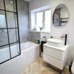 With rear and side aspect double glazed windows, panel enclosed L-shaped bath with mixer tap and electric shower over, shower boarding to walls, inset spot light, extractor fan, radiator and vinyl flooring.