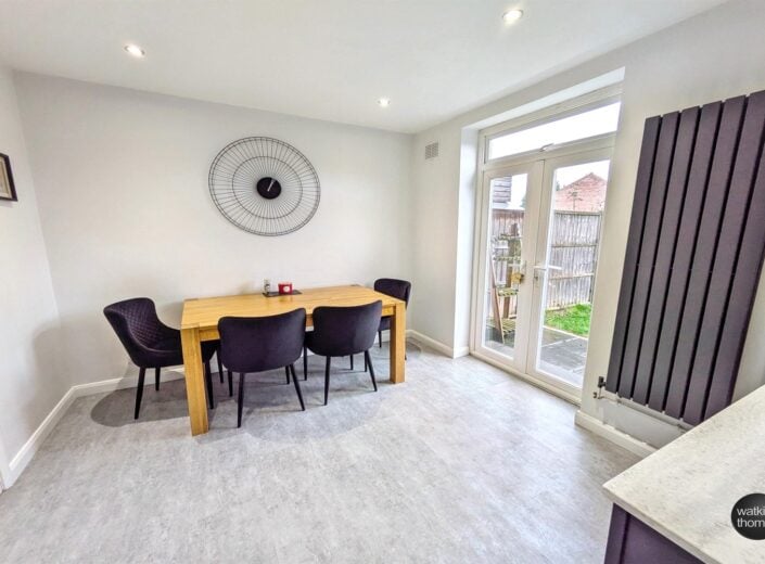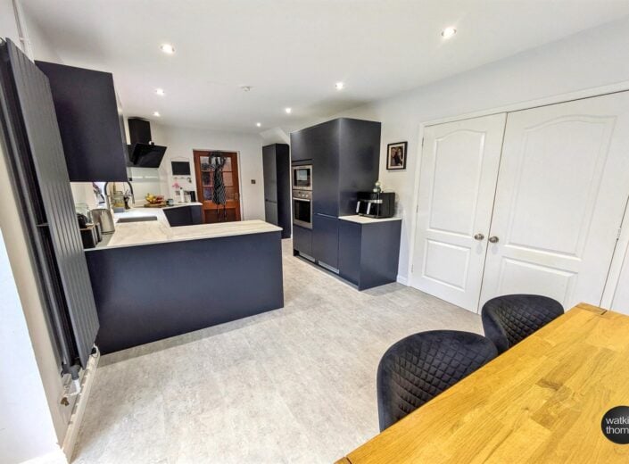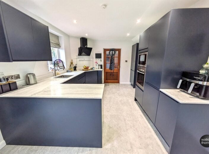 With rear aspect double glazed window. A range of units comprising sink drainer unit with Quartz work surface, base units under with matching wall units, integrated fridge freezer, integrated microwave and oven, electric hob with cooker hood over, cupboard housing the gas central heating boiler, inset spot lights, smoke alarm, side aspect glazed door to the side passageway and rear aspect double glazed French doors giving access to the rear garden.