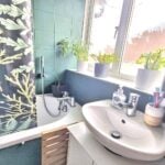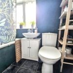 With side aspect double glazed window with suite comprising panel enclosed bath with electric shower over, low flush WC, pedestal mounted wash hand basin, partially tiled wall surround, heated towel rail and inset spotlights.