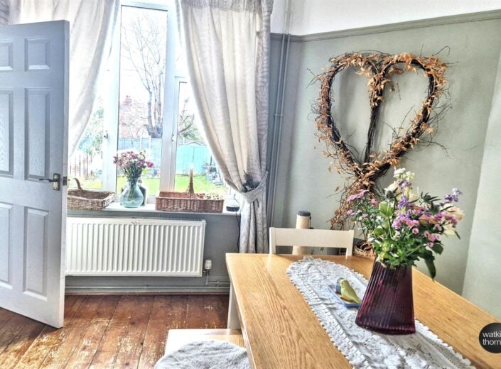 With two side aspect double glazed windows, smoke alarm, picture rail, panelled radiators, stairs to the first floor, exposed floorboards, thermostat for central heating, door to the sitting room and dining room.
