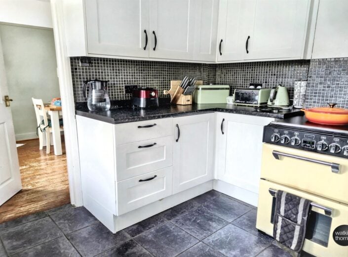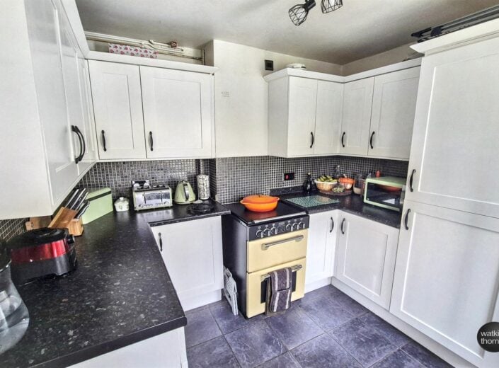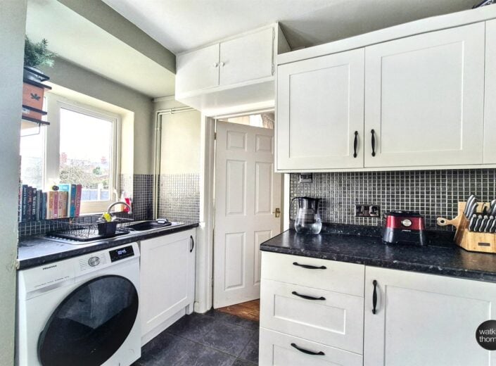 With rear aspect double glazed window, a range of units comprising stainless steel sink drainer unit with work surfaces, tiled splashbacks, base units under with matching wall units, integrated fridge freezer, plumbing and space for washing machine, space for cooker, tiled flooring and double glazed UPVC door to the garden.