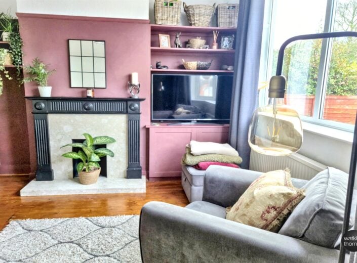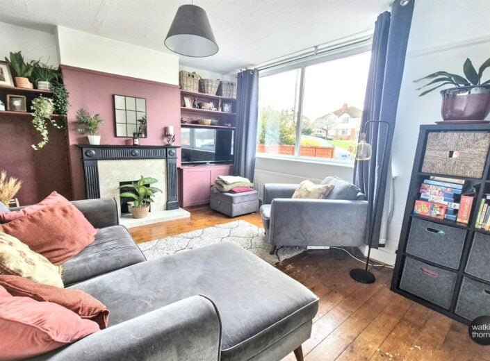 With front aspect double glazed half bay window, built in storage cupboard, decorative fire surround, picture rail, panelled radiator and exposed floorboards.