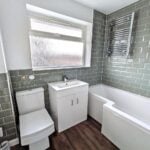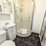 With shower cubicle with shower boarded surround, electric shower, low flush wc (Saniflo), vanity wash hand basin, heated towel rail, vinyl flooring, extractor fan and wall mounted dimplex heater.
