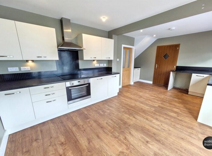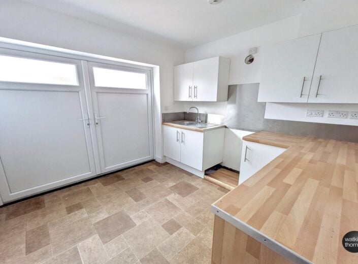 With two front aspect upvc double glazed panelled doors. A range of units comprising stainless steel sink drainer unit, work surface, a range of wall and base mounted units, vinyl flooring and smoke alarm.