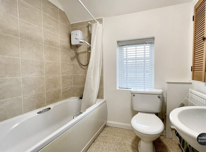 With white suite comprising bath with electric shower over, pedestal wash basin and low level wc.  Part tiled walls, radiator and over-stair cupboard in which is housed the wall mounted gas fired boiler which provides central heating and domestic hot water.