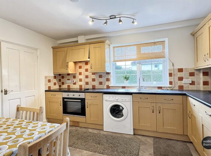 With a double glazed window to the side and having fitted base cupboard units with roll edged working surfaces over, tiled surrounds and matching eye level cabinets.  Single drainer stainless steel sink unit with mixer tap, recess with plumbing for washing machine, fitted oven with hob over and cooker hood above.  Radiator and door to: