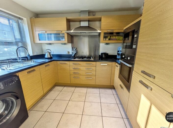 With front aspect double glazed window, a range of units comprising one and a half bowl stainless steel sink drainer unit, work surface, splashbacks, base units under with matching wall units, integrated electric oven, integrated microwave, gas hob with cooker hood over, plumbing and space for washing machine, cupboard housing the gas central heating boiler, integrated fridge/freezer, wine rack, inset spotlights, panelled radiator and tiled flooring.