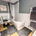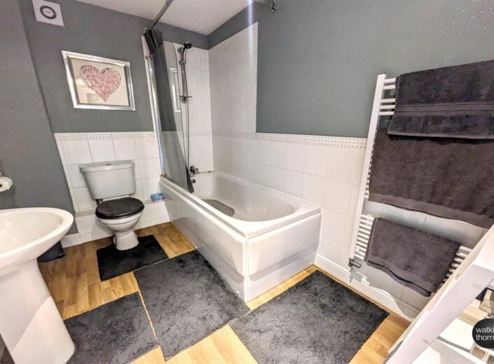 With suite comprising panel enclosed bath with mixer tap and shower attachment, pedestal mounted wash hand basin, low flush WC, heated towel rail, light with shaver point, extractor fan and vinyl flooring.