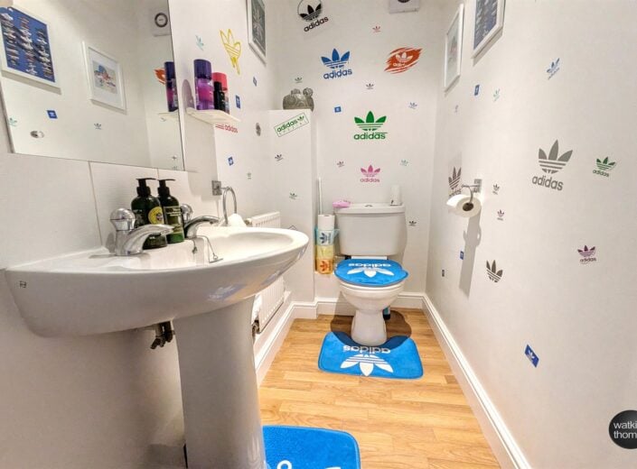 With low flush WC, pedestal mounted wash hand basin, tiled splashback, panelled radiator, extractor fan and vinyl flooring.