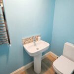 With low flush WC, pedestal mounted wash hand basin, tiled splashback, heated towel rail, extractor fan and tiled flooring.