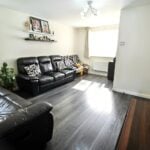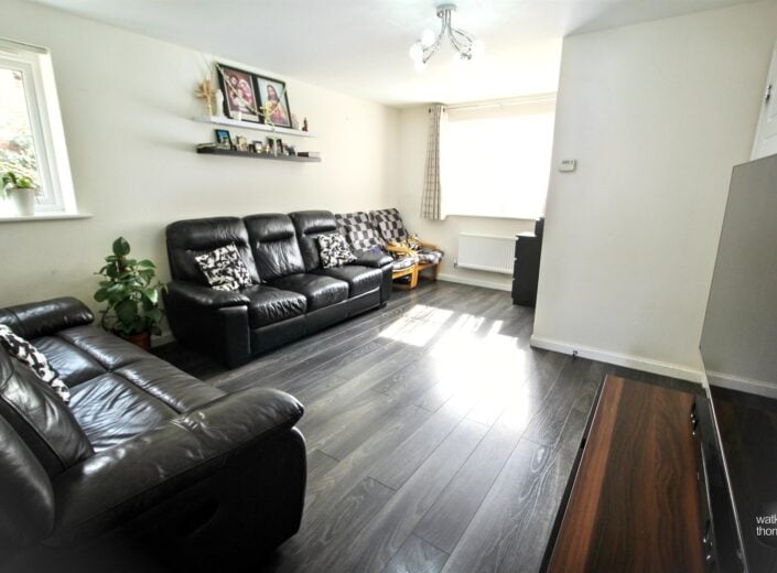 L shaped room with front and side aspect double glazed window, panelled radiator, thermostat for central heating, TV point, laminated flooring and door the kitchen/dining room.