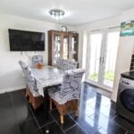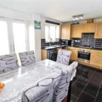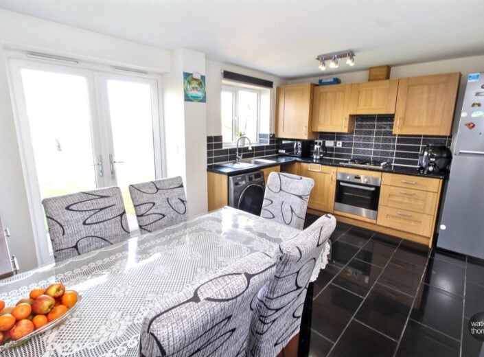 With rear aspect double glazed window, a range of units comprising stainless steel sink drainer unit with work surface, tiled splashbacks, base units under with matching wall units, integrated electric oven and gas hob with cooker hood over, plumbing and space for washing machine, plumbing and space for slimline dishwasher, cupboard housing the Ideal gas central heating boiler, space for upright fridge/freezer, panelled radiator, under stairs storage cupboard, space for dining table, tiled flooring and double glazed french doors giving access to the rear garden.