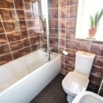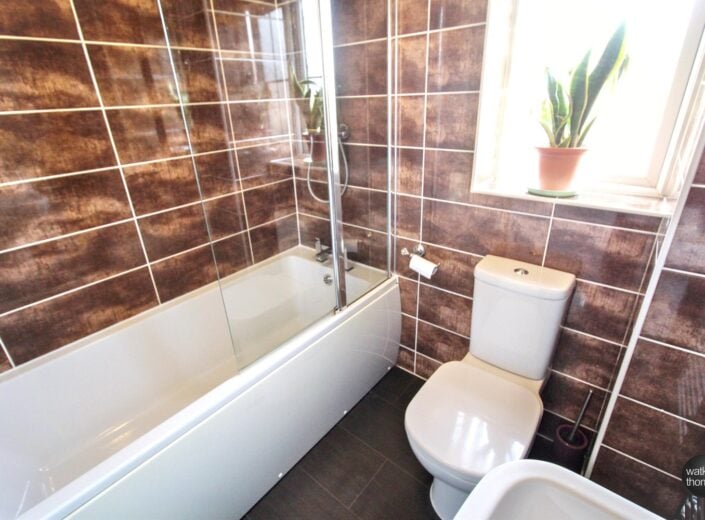 With rear aspect double glazed window, suite comprising panel enclosed bath with mixer tap and thermostatically controlled shower over, pedestal mounted wash hand basin, low flush WC, fully tiled wall surround, heated towel rail, extractor fan and vinyl flooring.