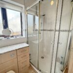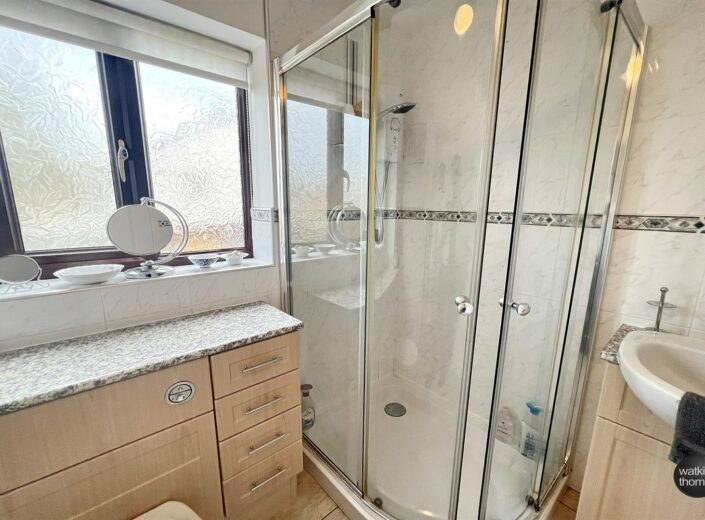 With rear aspect double glazed window and suite comprising shower cubicle with electric shower, partially tiled wall surround, low flush WC, vanity wash hand basin, heated towel rail, light with shaver point and tiled flooring.