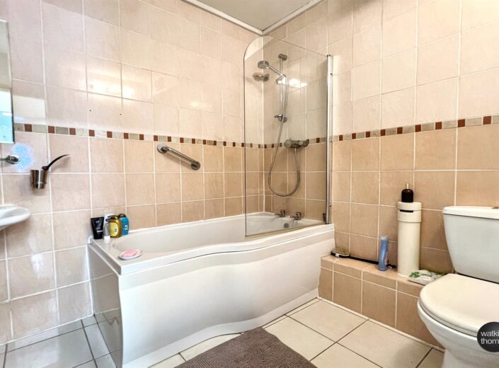 With part tiled walls, tiled floor and white suite comprising shower end bath with thermostatically controlled shower over, low level wc and pedestal wash basin. Extractor unit and a ladder type radiator.