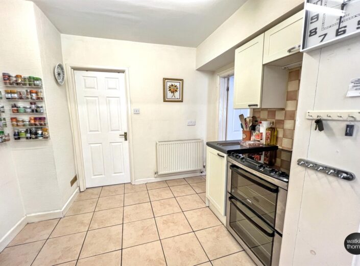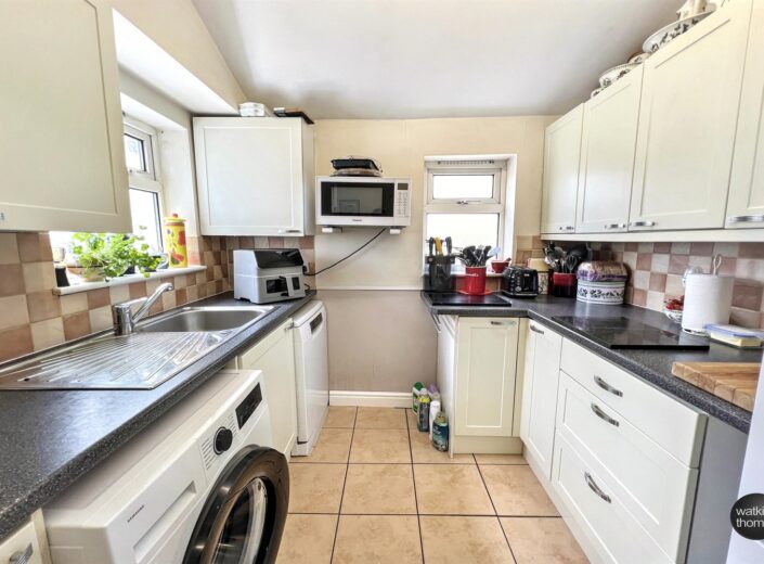With double glazed windows to two aspects and having a range of fitted base cupboard and drawer units with working surface over, tiled surrounds and eye level cabinets. Space for upright fridge freezer, recess with plumbing for washing machine, single drainer stainless steel sink unit with mixer tap, recess with plumbing for dishwasher and recess for cooker. Ceramic floor tiles, radiator, panel style doors to bedroom 1 and the bathroom.