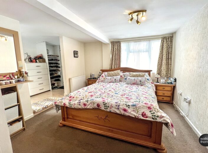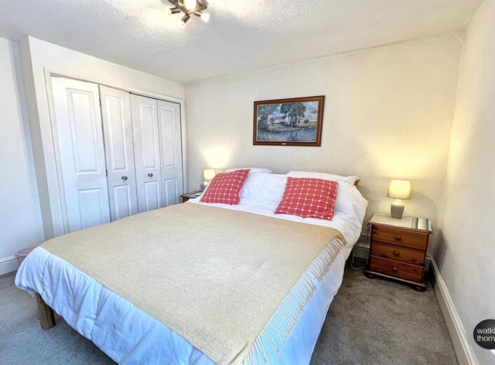With wardrobe space with folding doors, double glazed window to the front, radiator and a deep over-stair storage cupboard with fitted shelves.
