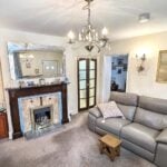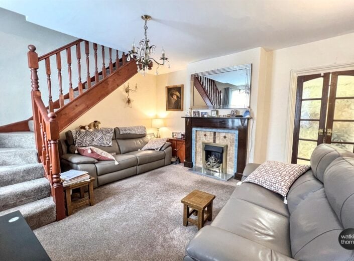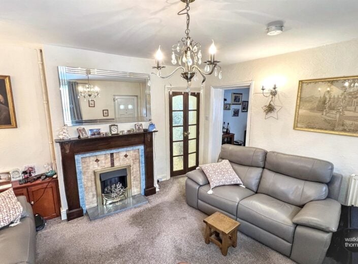 With a double glazed window to the front, wall light points, radiator, under-stairs storage cupboard, further cupboard and with a period fire surround and living flame gas fire. Pair of doors to the kitchen and with an opening to the: