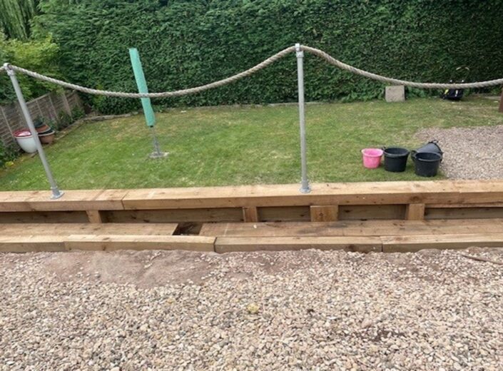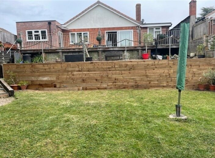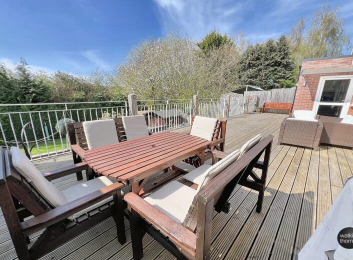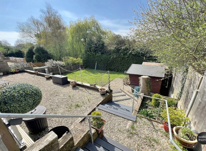 A block pavior pathway leads to the front door. At the rear of the property there is an raised deck (43'5 x 8'9 widening to 13'9) which lies across the rear of the residence and provides for an exceptional entertaining area. The deck is bounded by a fence between wooden posts and a flight of steps then lead down to a middle garden which again is the width of the plot and about 12'3 wide. This area is laid to stone and at the lower level there is a lawn bounded by an evergreen hedge. There is also a steel garden shed and a further garden store.