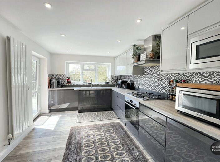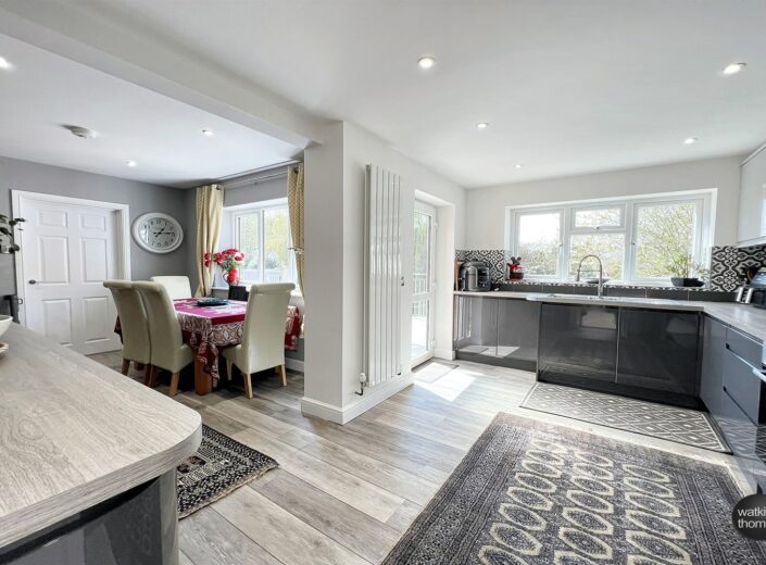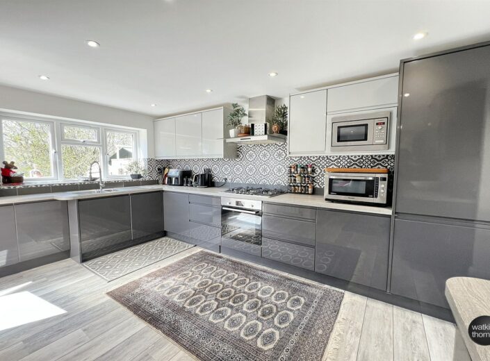 With a double glazed window to the rear, double glazed door to the sun terrace/decked area, vertical radiator and extensively fitted with high gloss, soft close, base cupboard and drawer units with working surface over and tiled courses above to the range of eye level cabinets. Built-in fridge and freezer units, built-in electric oven with five ring gas hob over and cooker hood above together with a 1½ bowl stainless steel sink unit with drainer and flexible head mixer tap. Built-in dishwasher. Door to garage. Throughout the kitchen there are sunken ceiling lights.