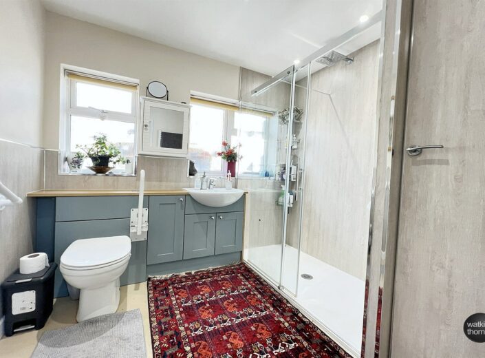 Attractively appointed and with suite comprising shower cubicle with easy access lip and shower well together with shower boarded walls and thermostatically controlled twin headed shower unit. Vanity wash basin with cupboards below and low level wc. Two double glazed windows, electric vertical radiator and boiler cupboard in which is housed the wall mounted gas fired combination boiler which provides central heating and domestic hot water.