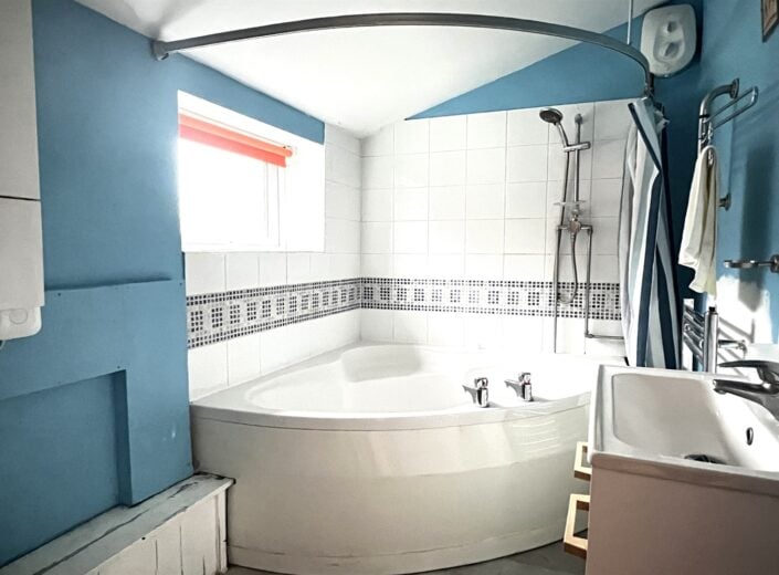With white suite comprising corner bath, vanity wash basin with cupboards below and a low level WC. Over the bath there is a thermostatically controlled shower unit and there is also a wall mounted gas fired boiler which provides central heating and domestic hot water. Ceramic floor tiles, double glazed window and ladder type radiator.