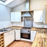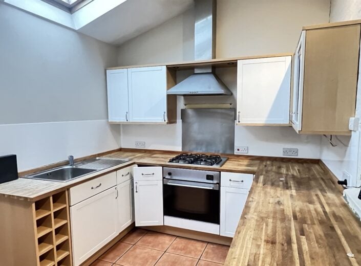 A feature addition to the property with high ceiling and two velux roof lights and having base cupboards and drawer units with wood block working surfaces over, wooden upstands and eye level cabinets including a glass fronted unit. Recess with plumbing for washing machine, oven with four ring gas hob over and single drainer stainless steel sink unit. Cooker hood, wall light points, radiator, ceramic floor tiles, door to rear and door to;
