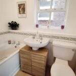 With low flush wc, vanity wash hand basin with tiled splash back, panelled radiator, tiled flooring and extractor fan.