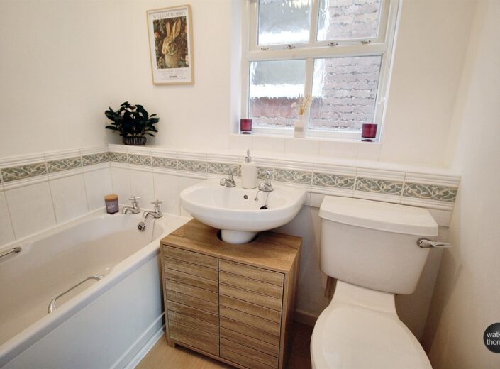 With side aspect double glazed window with fitted blinds. Suite comprising panel enclosed bath, pedestal mounted wash hand basin, low flush wc, partially tiled wall surrounds and panelled radiator.