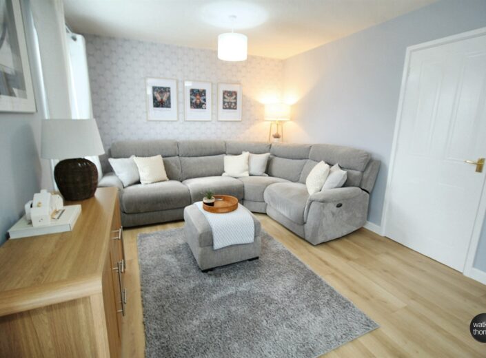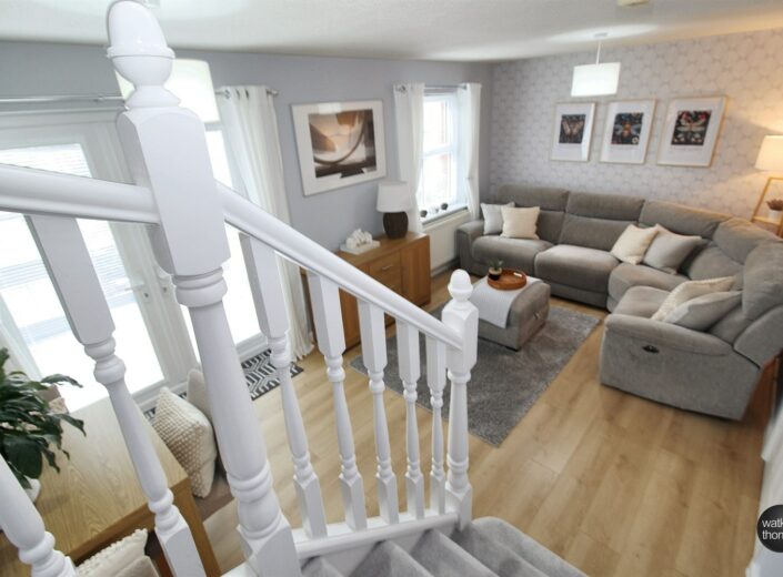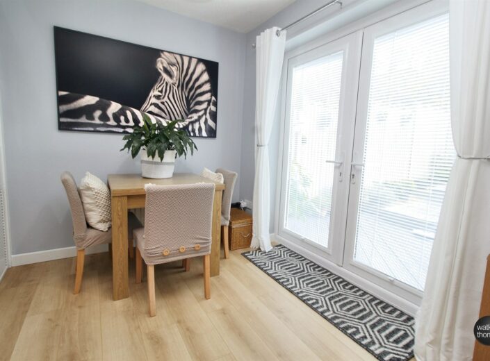 With rear aspect double glazed window with fitted blinds, television point, smoke alarm, stairs to first floor, laminated flooring, space for dining table, under-stairs storage cupboard and rear aspect double glazed French doors with 'Perfect Fit' custom made blinds leading to the rear garden.