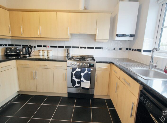 With front aspect triple glazed window with fitted blinds. A range of units comprising single drainer sink drainer unit, work surfaces, tiled splash backs, base units under with matching wall units, space for upright fridge freezer, plumbing and space for dishwasher, tiled flooring, wall mounted gas central heating boiler, space for cooker with cooker hood over.