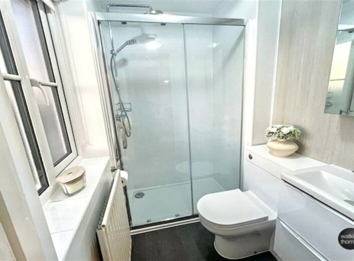 With front aspect triple glazed window with fitted blinds, double shower cubicle with thermostatically controlled shower and rainwater shower head. Low flush wc, vanity wash hand basin, shower boarded surround and extractor fan.