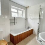 With suite comprising bath with shower and mixer tap attachment, corner shower cubicle with electric shower, pedestal wash basin and low level WC. Double glazed windows, radiator, tiled walls and tiled floor.