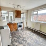 With a double glazed window to the side, double glazed door and window to the conservatory and with wood fronted base cupboard units with working surface over, part with tiled surround and eye level cabinets. Radiator, single drainer sink unit with mixer tap, recess for cooker and with a door to shelved cupboard.