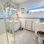 With side aspect double glazed window, double shower cubicle with thermostatically controlled shower, low flush WC, vanity wash hand basin, heated towel rail, fully tiled wall surround, extractor fan, inset spotlights and tiled flooring.