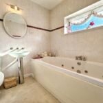 With front aspect double glazed window, suite comprising panel enclosed jacuzzi bath, feature wash hand basin, low flush WC, heated towel rail, fully tiled wall surround, extractor fan, shaver point and inset spotlights.
