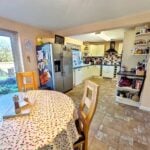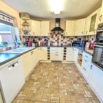 L shaped room with rear aspect double glazed window, a range of units comprising one and a half ceramic sink drainer with work surface, tiled splashback, base units under and matching wall units. Space for dishwasher, integrated electric double oven, electric induction hob with cooker hood over and remote controlled plinth heater below, panelled radiator, tiled flooring, dresser unit to dining area and rear aspect double glazed door and window to the rear garden.