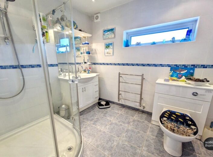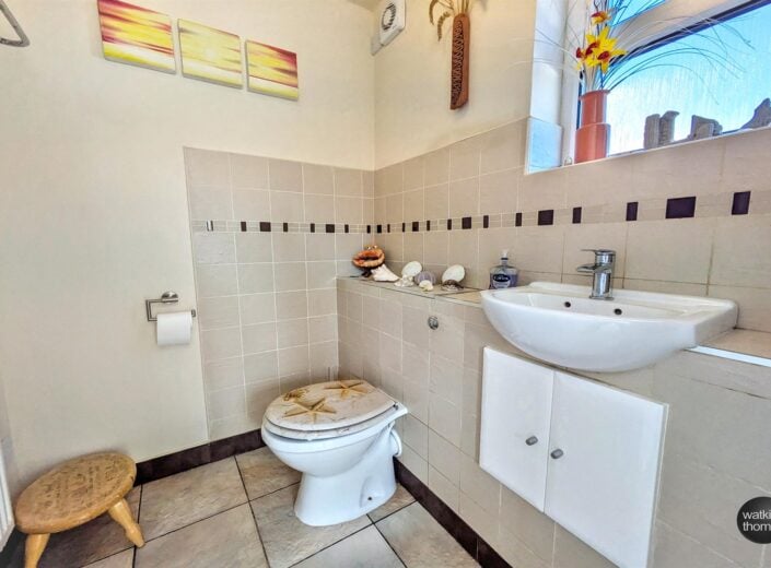 With side aspect double glazed window, low flush WC, vanity wash hand basin, panelled radiator, partially tiled wall surround, extractor fan and tiled flooring.