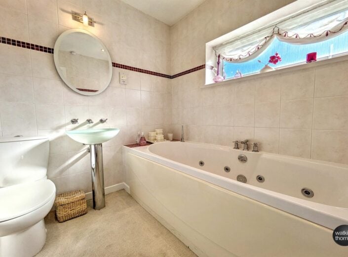 With front aspect double glazed window, suite comprising panel enclosed jacuzzi bath, feature wash hand basin, low flush WC, heated towel rail, fully tiled wall surround, extractor fan, shaver point and inset spotlights.