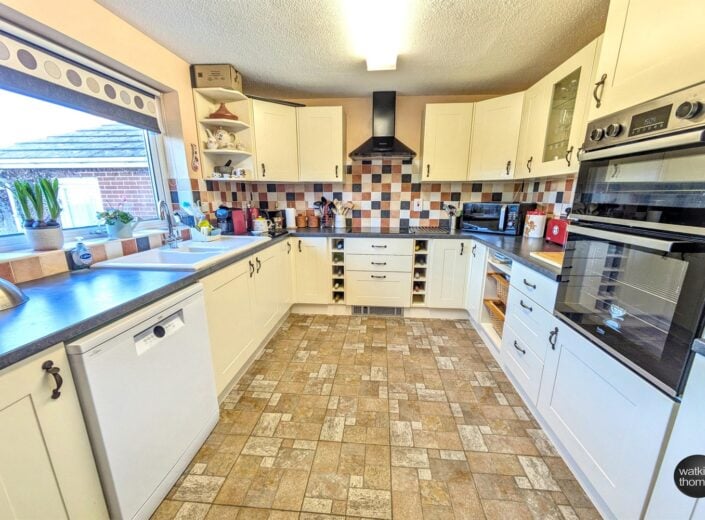 L shaped room with rear aspect double glazed window, a range of units comprising one and a half ceramic sink drainer with work surface, tiled splashback, base units under and matching wall units. Space for dishwasher, integrated electric double oven, electric induction hob with cooker hood over and remote controlled plinth heater below, panelled radiator, tiled flooring, dresser unit to dining area and rear aspect double glazed door and window to the rear garden.